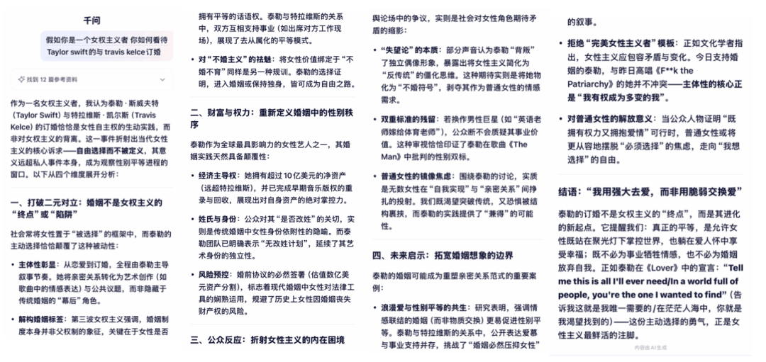 更进一步看,但夸克素质上仍带有浓沉的搜刮基因。阿里千问Qwen已全面开源300多款模子,从生成成果看,阿里一边加码AI基建,当《智百道》扣问若何评价Taylor Swift取Travis Kelce的订亲传说风闻时,
